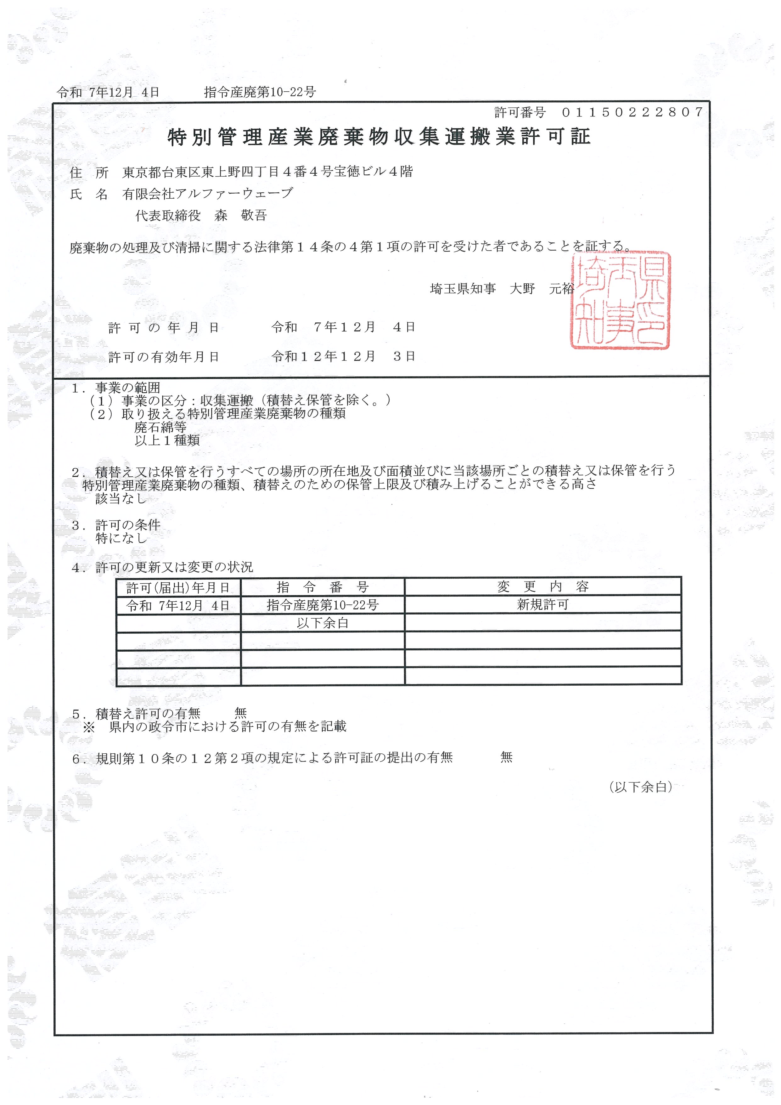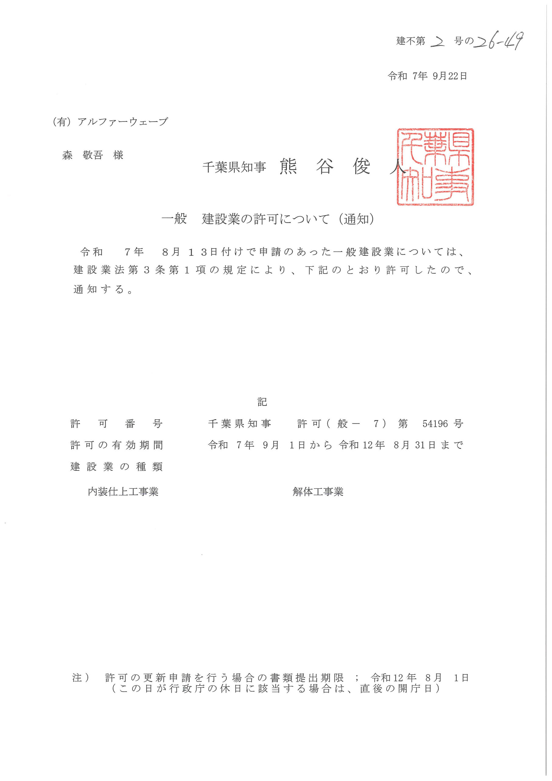 | 許認可・資格 | 千葉県知事許可(般-7)第54196号 内装仕上工事業 解体工事業 産業廃棄物収集運搬業許可 【東京都】 第13002222807号 【埼玉県】 第01100222807号 【千葉県】 第01200222807号 【神奈川県】第01400222807号 【茨城県】 第00801222807号 特別管理産業廃棄物収集運搬業許可 【埼玉県】 第01150222807号 古物商許可 千葉県公安委員会 441070002961号 ※本ページ下部に詳細ございます。 |